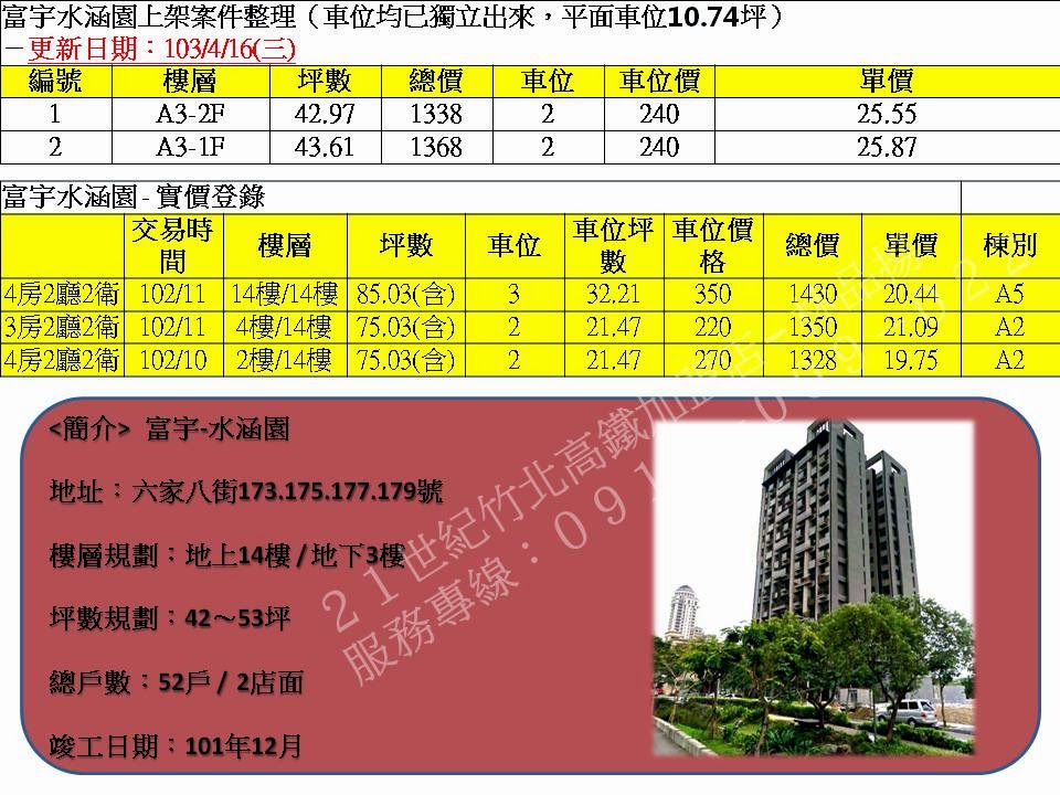[竹北高鐵] 2014年4月份上市案件整理(水林園.水涵園)2014-04-16HSR上市案件_2014年4月份 水林園這個月釋出了兩間,分別是面六家五路一段的B1-13F及內棟的B3-2F。兩者皆有一個車位,B1-13F為平面車位,B3-2F為機械車位。 水涵園也釋出了兩棟,分別為面河岸A3棟的2樓及13樓。兩者皆有兩個平面車位。二樓為露臺戶。 上一 文章 [竹北高鐵] 2014年4月份上市案件整理(宏觀大器.雅砌.極光琉璃.三十二品.時尚廣場) 下一 文章 [竹北高鐵] 建案介紹 - 坤山水漾